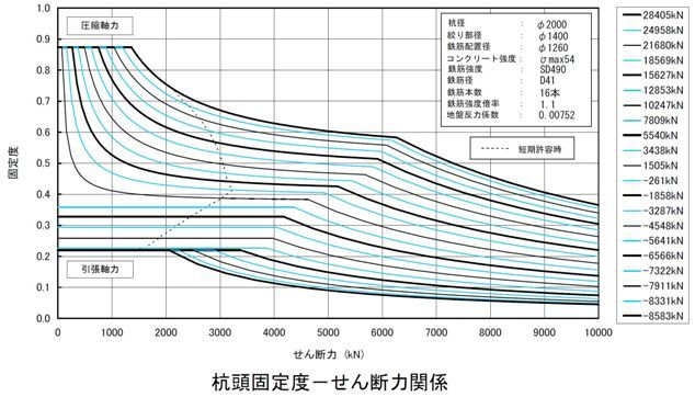 杭の仕様仮定後に杭頭モーメントと回転角の関係を算定し、せん断力を各杭の固定度に応じて分配する点が、従来型の設計法との大きな違いです。